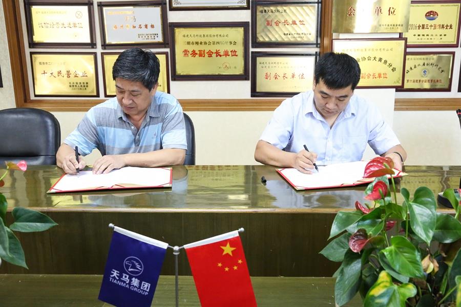 天馬科技陳慶堂董事長(右)與福建師范大學福清分校陳盛校長(左)簽訂校企戰(zhàn)略合作協(xié)議