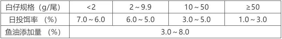 ? 根據(jù)存池白仔的規(guī)格及數(shù)量、氣候、水溫、水質(zhì)、白仔的生長(zhǎng)及攝食狀況等因素進(jìn)行適當(dāng)?shù)卣{(diào)整。